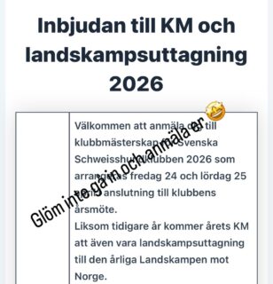 Det är med stor glädje vi vill bjuda in er till årsmöteshelg i Arboga 24-26 april. Vi kommer detta år hålla klubbmästerskap och landskampsuttagning.Årsmötet sker efter lunch på lördagen och