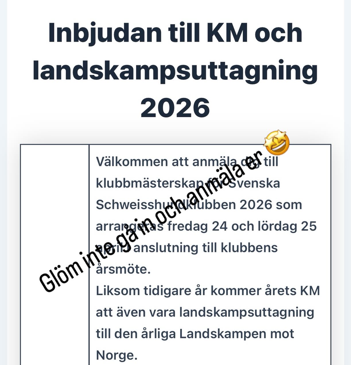 Inbjudan till KM och landskampsuttagning 2026 Välkommen att anmäla dig till klubbmästerskap för Svenska Schweisshundklubben 2026 som arrangeras fredag 24 och lördag 25 april i anslutning till klubbens årsmöte.Liksom tidigare